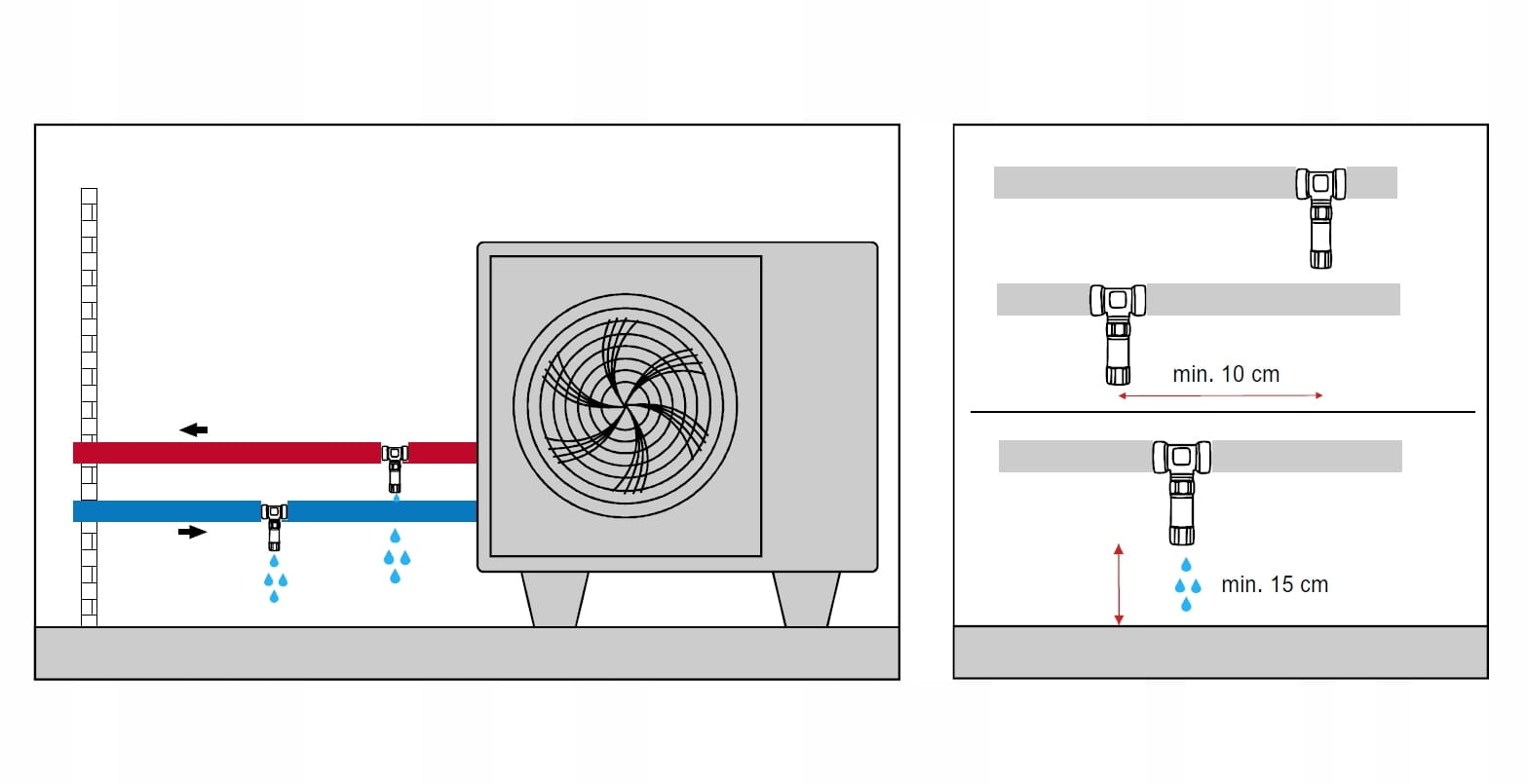 Zawór zamontowany na rurze dolnej nie powinien i nie może stykać się z gruntem czy też fundamentem pompy ciepła, spust powinien być oddalony co najmniej jedną długość zaworu (min. 15 cm). Zawór powinien być zamontowany z dala od jakiegokolwiek dodatkowego elementu źródła ciepła, by nie zakłócić prawidłowego działania zaworu. Należy zachować odstęp przynajmniej 10 cm między zaworami antyzamarzaniowymi.