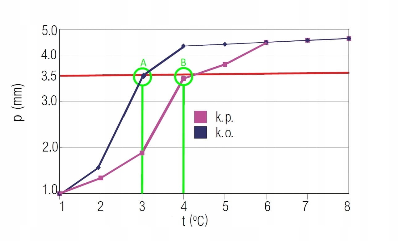 Punkty A i B na krzywej to pozycje otwarcia i zamknięcia zaworów. Zawór otwiera się przy temp. 3°C, pełne zamknięcie następuje przy 4ºC. Pełne otwarcie (maksymalny wypływ) następuje przy 1ºC.