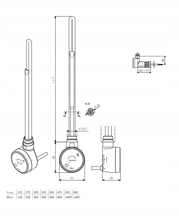 Długość elementu grzewczego wynosi 300 mm (± 5 mm).