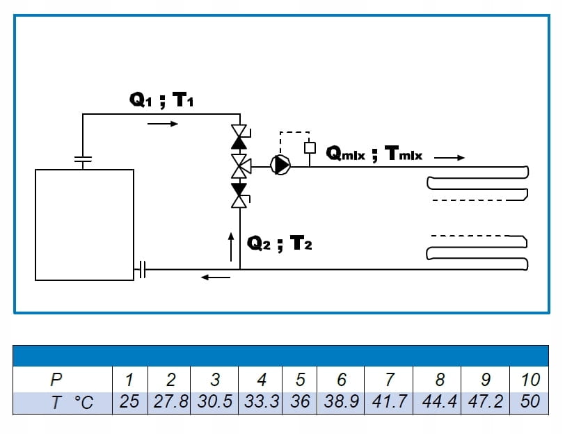 OPIS TABELKI (na schemacie instalacji zaworu AQUAMIX w grzejnikowym systemie ogrzewania):